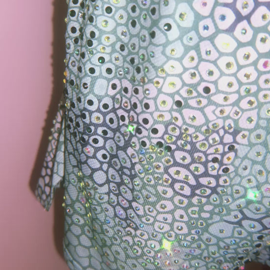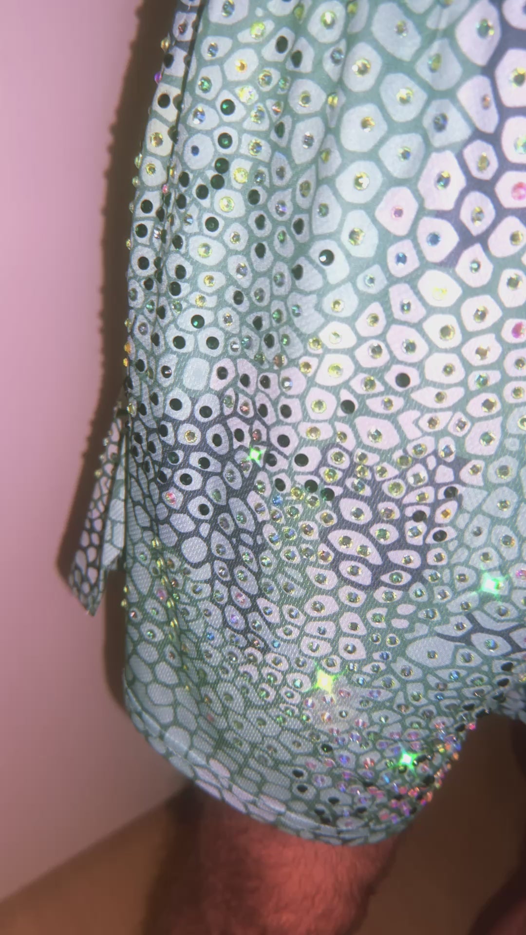 Featuring an iridescent, snake-inspired print with hand-embellished rhinestones that catch the light (and eyes) from every angle, they're made for dance floors, poolside flirtations, and nights that end with glitter in unexpected places. Lightweight, breathable, and dangerously fun-these shorts move with you, whether you're striking or just showing off your scales. 🪩