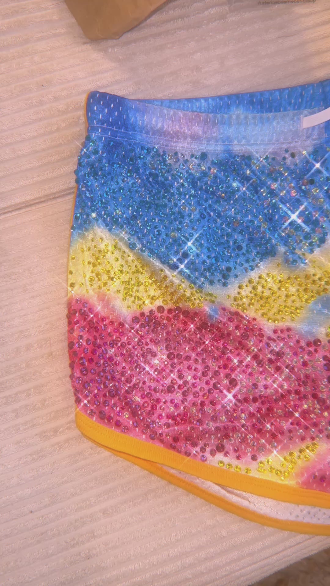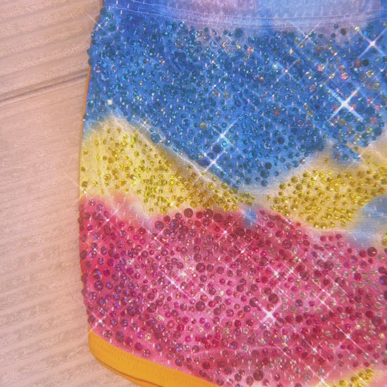 The Technicolor Tease Shorts are a head-turning, hand-embellished masterpiece-drenched in radiant rhinestones over a custom rainbow mesh base. Designed to flirt with every flash of light and every second glance, these shorts aren't just a vibe... they're a statement. 🤩